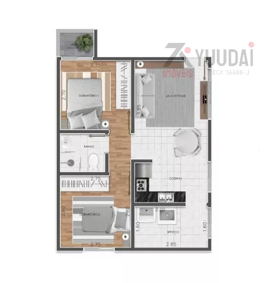 ACOMODAÇÕES: 2 DORMITÓRIOS, SALA, COZINHA, 1 BANHEIRO, ÁREA DE SERVIÇO